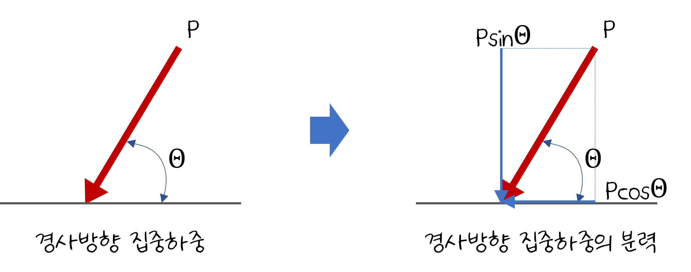 이렇게 하중이 경사방향으로 작용하는 경우 구조물의 반력을 구하려면 경사방향으로 작용하는 하중을 수평방향의 분력과 수직방향의 분력으로 나누어서 계산하는 것이 편리합니다.