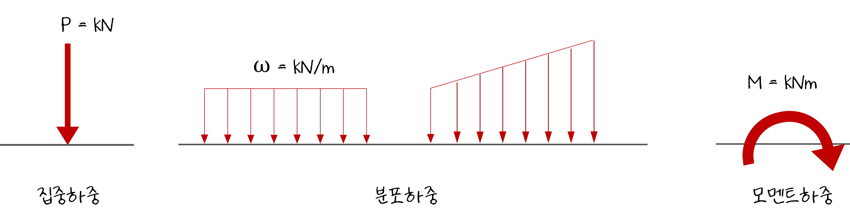 집중하중은 한 지점에 작용하는 힘이기 때문에 단위는 N이나 kN이 되고, 분포하중은 일정한 구간에 등분포로 작용하는 경우 단위 길이당 작용하는 힘의 크기를 나타내기 때문에 N/m 또는 kN/m으로 나타냅니다. 모멘트는 힘과 거리의 곱으로 계산되므로 N·m 또는 k N·m이 단위가 됩니다.