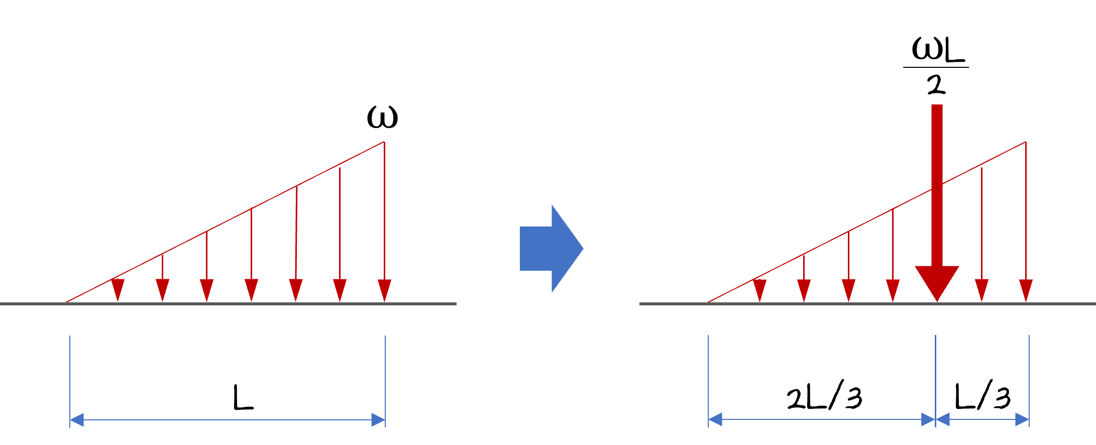 이렇게 분포하중이 작용할 때 지점의 반력을 구하기 위해서는 이 하중을 단순화할 필요가 있습니다. 일정 구간에 작용하는 하중의 전체 합력을 구해서 집중하중의 형태로 작용하는 것으로 단순화시켜서 계산합니다.