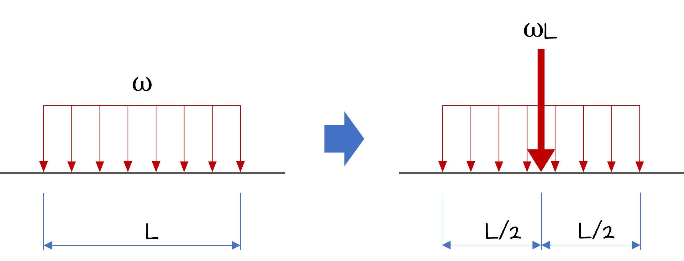 이렇게 등분포하중이 작용할 때 작용하는 반력을 직접 계산하기가 어렵습니다. 그래서 등분포하중을 단순화해서 계산하는데, 다음 그림과 같이 등가의 집중하중이 하중의 중심위치에 합력으로 작용한다고 계산합니다.