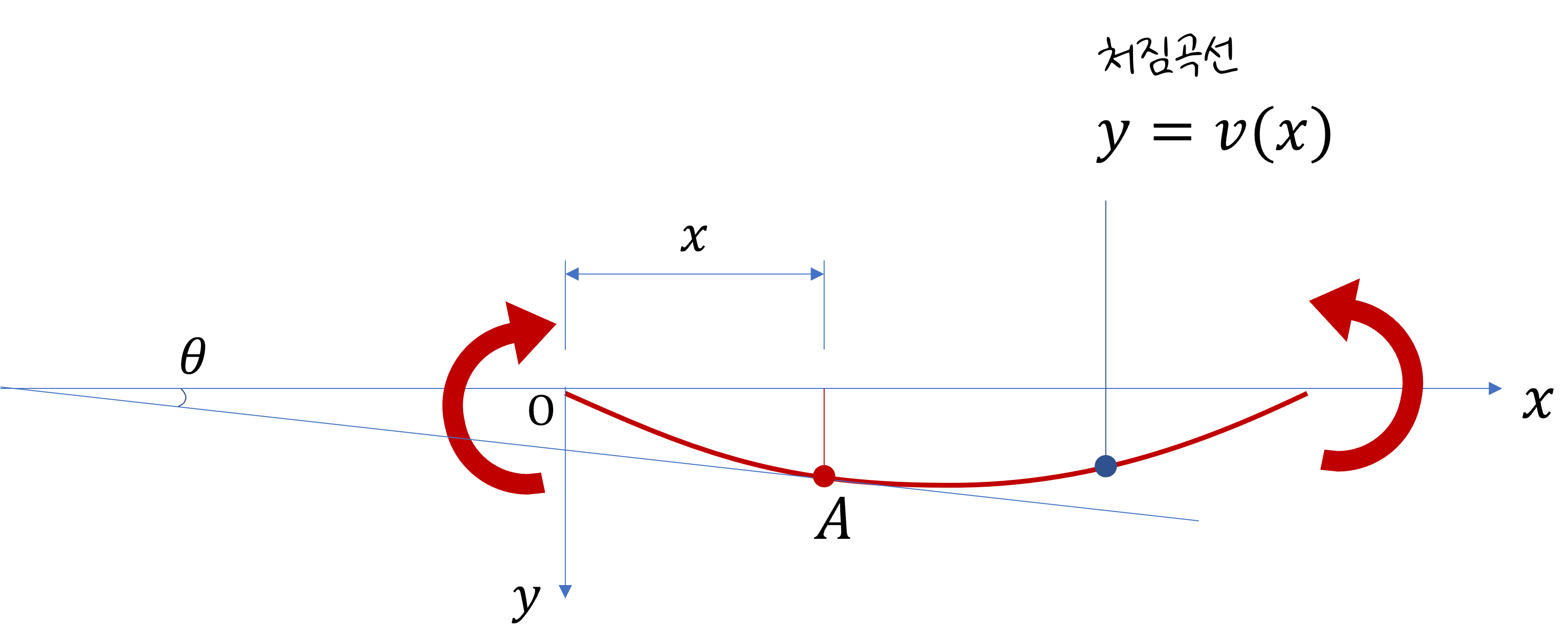 위 그림에서 보의 좌측단 o에서 x만큼 떨어진 위치가 A지점이라고 할 때 이 미소부분을 확대하면 다음과 같이 됩니다.