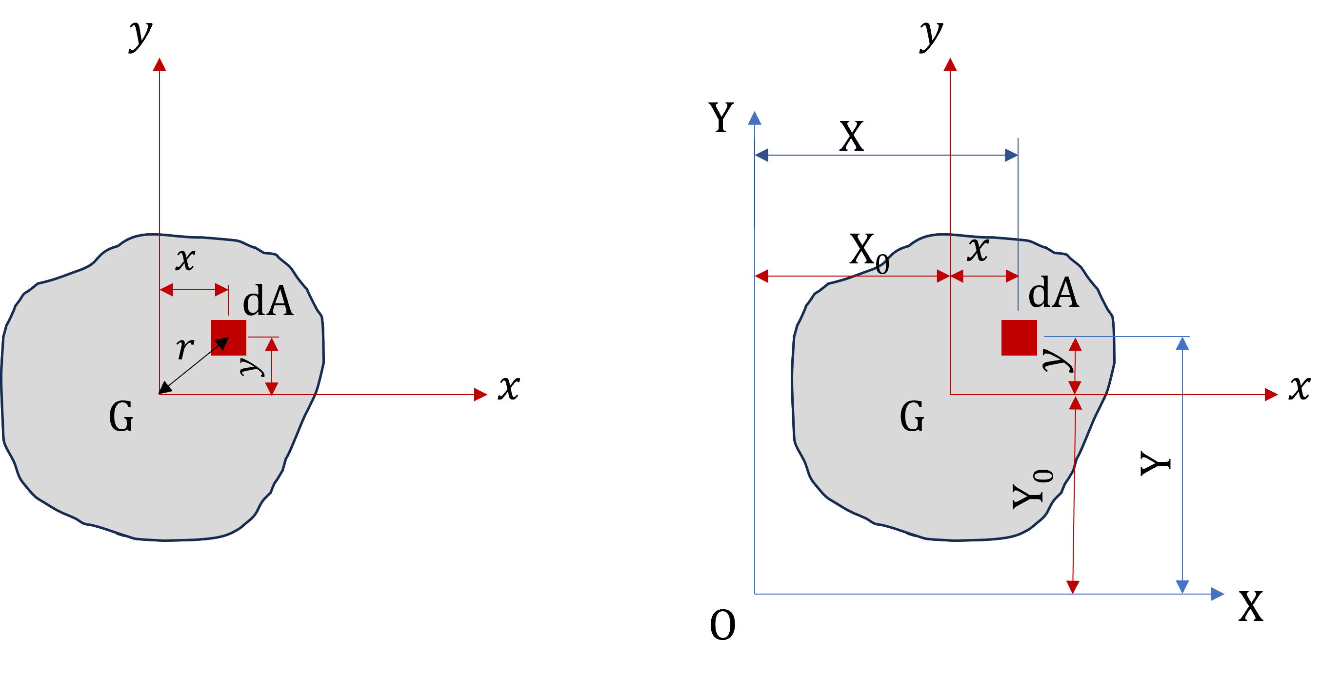 위 그림에서 오른쪽 그림과 같이 좌표축이 도심에서 떨어져 있을 경우 단면2차모멘트는 다음과 같이 계산할 수 있습니다.
