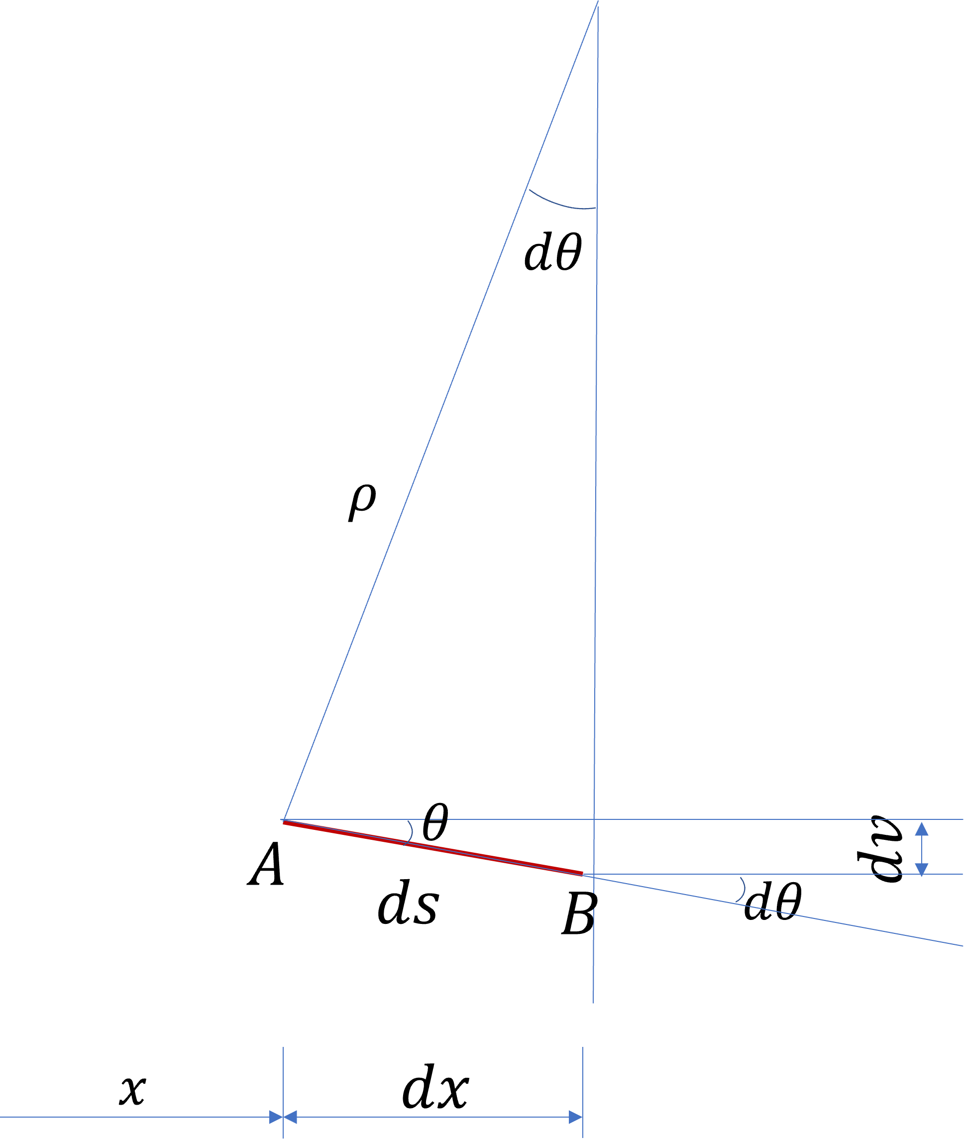 여기서 곡률반경( ρ)은 곡률(Φ)의 역수이고, 처침량의 증분 dv이 충분히 작다면 다음과 같이 나타낼 수 있습니다.