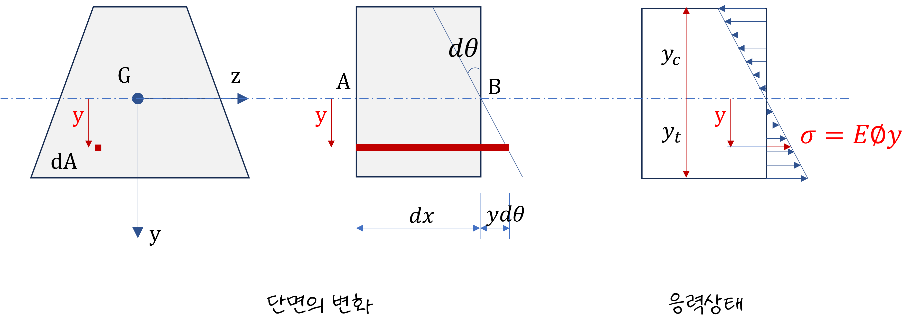 응력도를 따질 때는 모형을 단순화하기 위해 평면이 유지된다고 가정하겠습니다. 이 때 중립축으로부터 y만큼 떨어진 지점의 변형량은 그림과 같이 ydΘ가 됩니다. 따라서 이 지점의 변형도는 ε= yd Θ /dx = Φy가 됩니다.