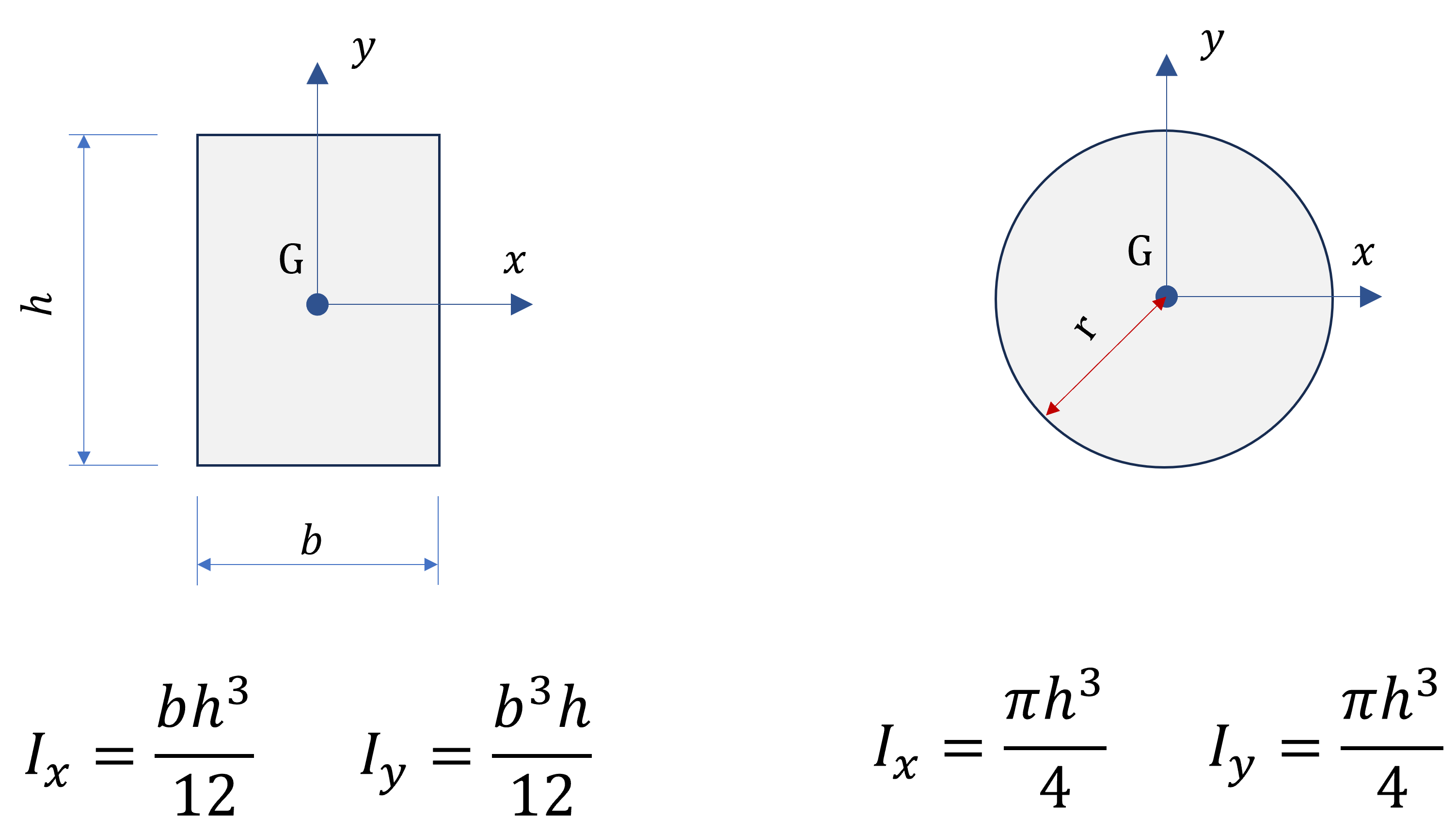 대표적인 단면의 단면2차모멘트값은 다음과 같습니다.