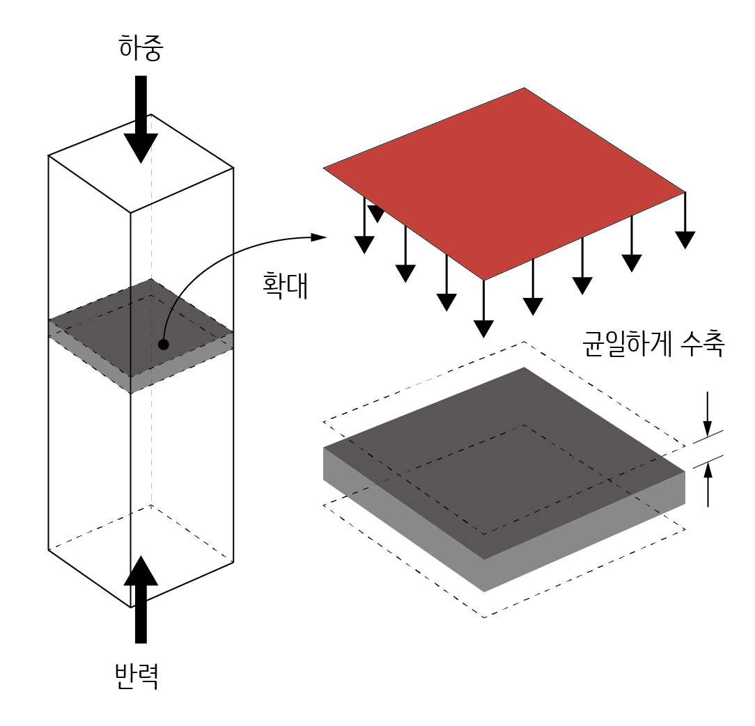 너무나 당연한 이야기지만 사실 기둥이 통통해지면 달라질 수 있습니다. 어쨌든 보통 크기의 기둥에서는 이 가정이 타당하다고 볼 수 있습니다. 축력이 작용하면 부재 내부 단면에 발생하는 응력은 매우 단순하게 나타나고(Uniform stress distribution), 기둥 내부에 있는 입자들은 서로 비슷하게 누르는 힘을 받습니다. 그래서 압축을 받는 기둥에는 압축력에 강한 재료만 쓰면 됩니다. 전통적으로 돌과 콘크리트가 압축력에 강하지요.
