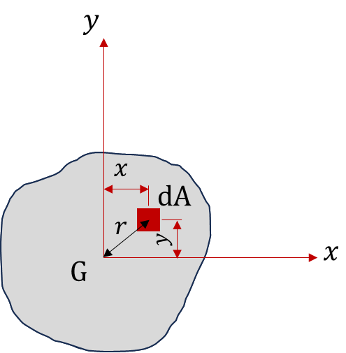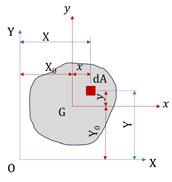 일반적인 상황을 표현하기 위해 다음과 같이 불규칙한 단면으로 만들어진 부재가 있다고 가정해보겠습니다. 여기서 도심을 G라고 하고 도심을 원점으로 한 2차원 그래프를 그리면 다음과 같이 나타낼 수 있습니다.