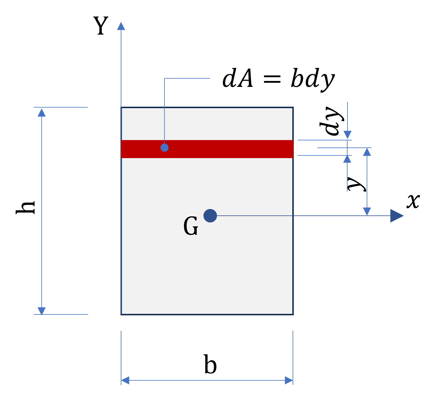 단면2차모멘트는 미소 단면 dA와 거리의 제곱을 적분한 것으로 각각의 축에 대해 다음과 같이 나타낼 수 있습니다.