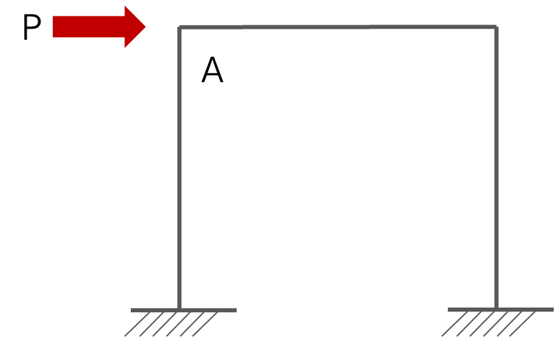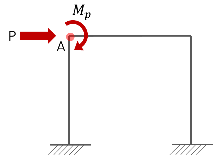 이 구조물에 지진하중 p가 작용한다고 할 때, 절점 A가 최대 응력에 도달했다고 가정해 보겠습니다. 이 경우 절점 A는 소성항복상태에 도달하게 되고 더 이상 모멘트를 부담할 수 없는 상태가 되는데, 이 때 A절점은 더 이상 하중을 부담할 수 없으며 무한하게 변형이 증가하는 상태가 됩니다. 즉 A점이 소성힌지가 됩니다.