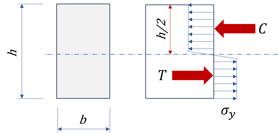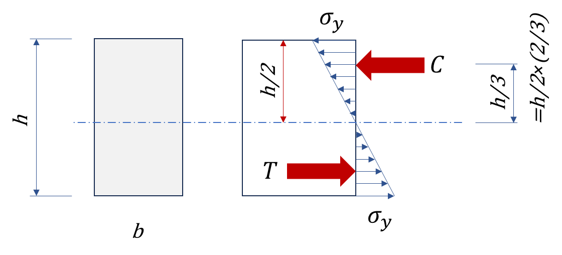 휨응력의 크기는 압축응력의 합력 또는 인장응력의 합력에 두 힘 사이의 거리( 여기서는 거리가 h/2)를 곱한 값이므로 다음과 같이 계산할 수 있습니다.