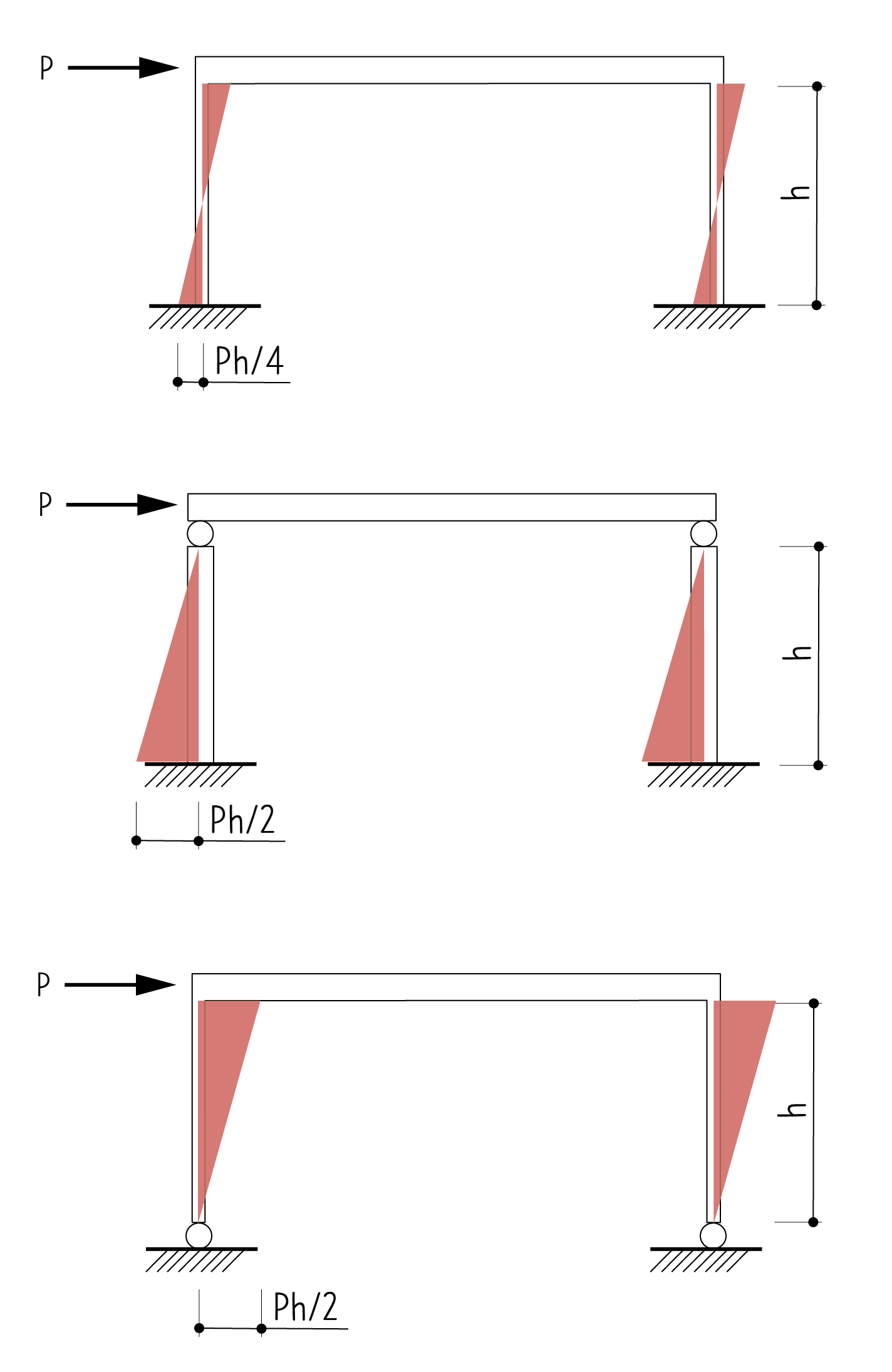 기둥에 수평하중이 작용할 때 기둥에 생기는 휨모멘트는 기둥과 보의 접합상태 그리고 기둥과 기초의 접합상태에 따라 달라집니다.
