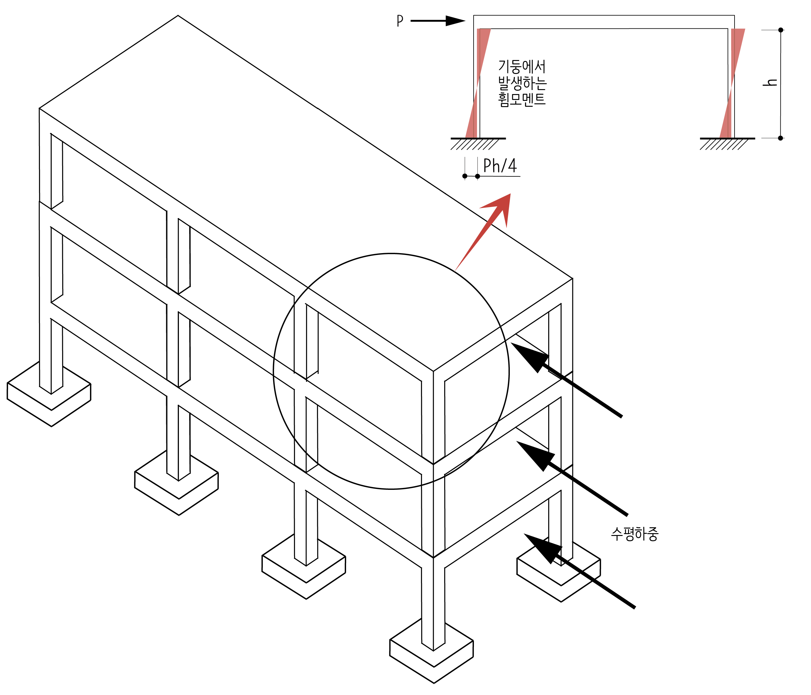 기둥과 보로 강접합된 라멘구조방식은 기둥이 어느 정도 수평하중을 부담할 수 있습니다. 이렇게 수평하중이 작용하게 되면 기둥에는 휨모멘트뿐 아니라 전단응력도 발생합니다.