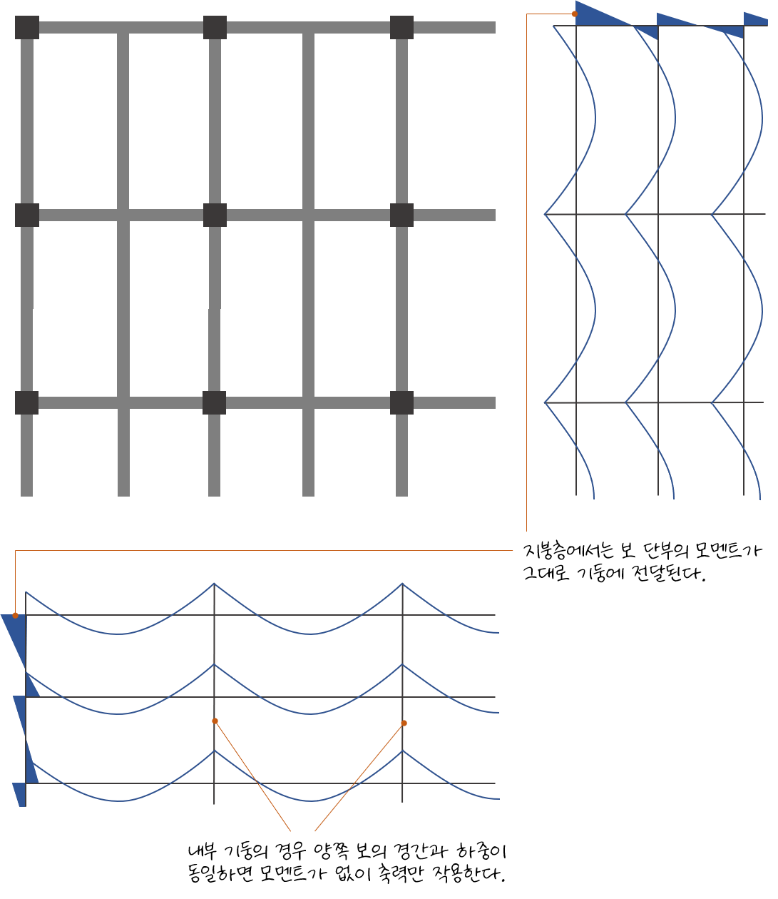 기둥은 대부분 연직하중에 의한 축력을 부담하지만 휨모멘트가 크게 작용하는 기둥도 있습니다. 최상층에 있는 기둥이나 외곽에 있는 기둥은 모멘트에 의해 단면의 크기와 철근량이 결정됩니다.