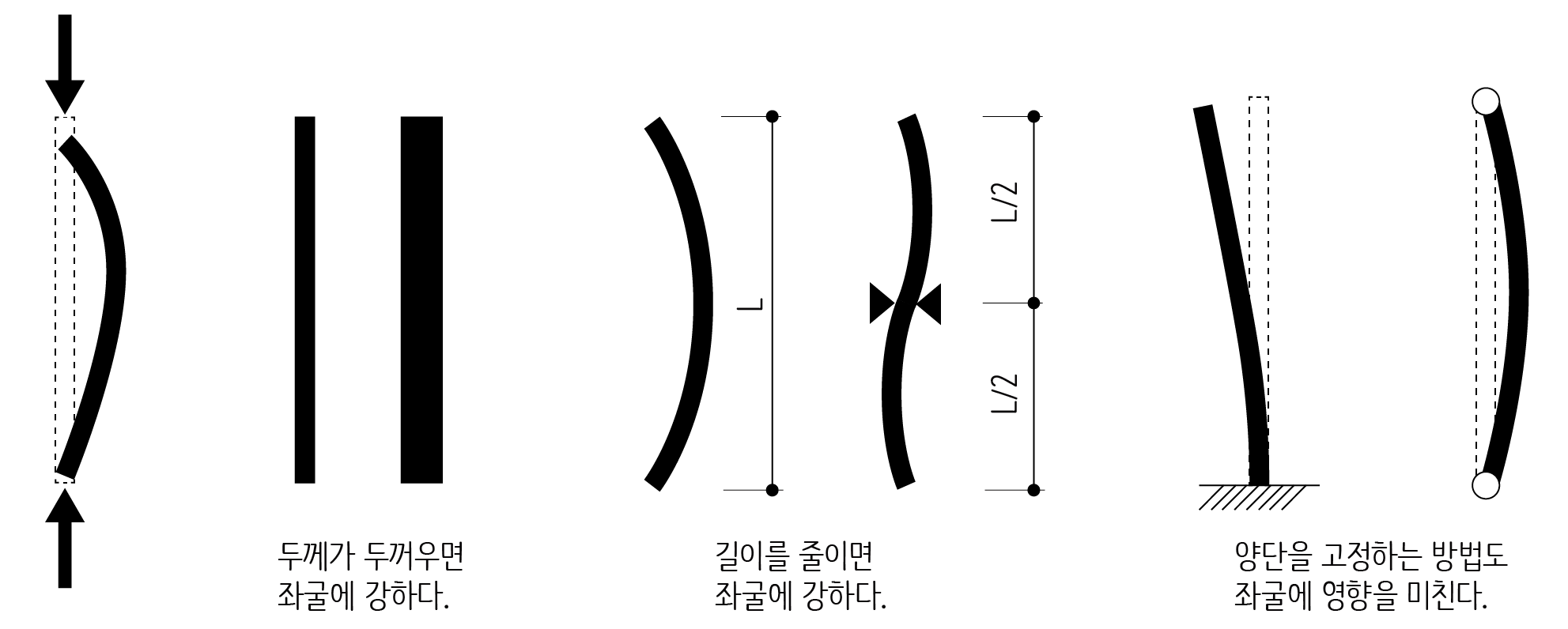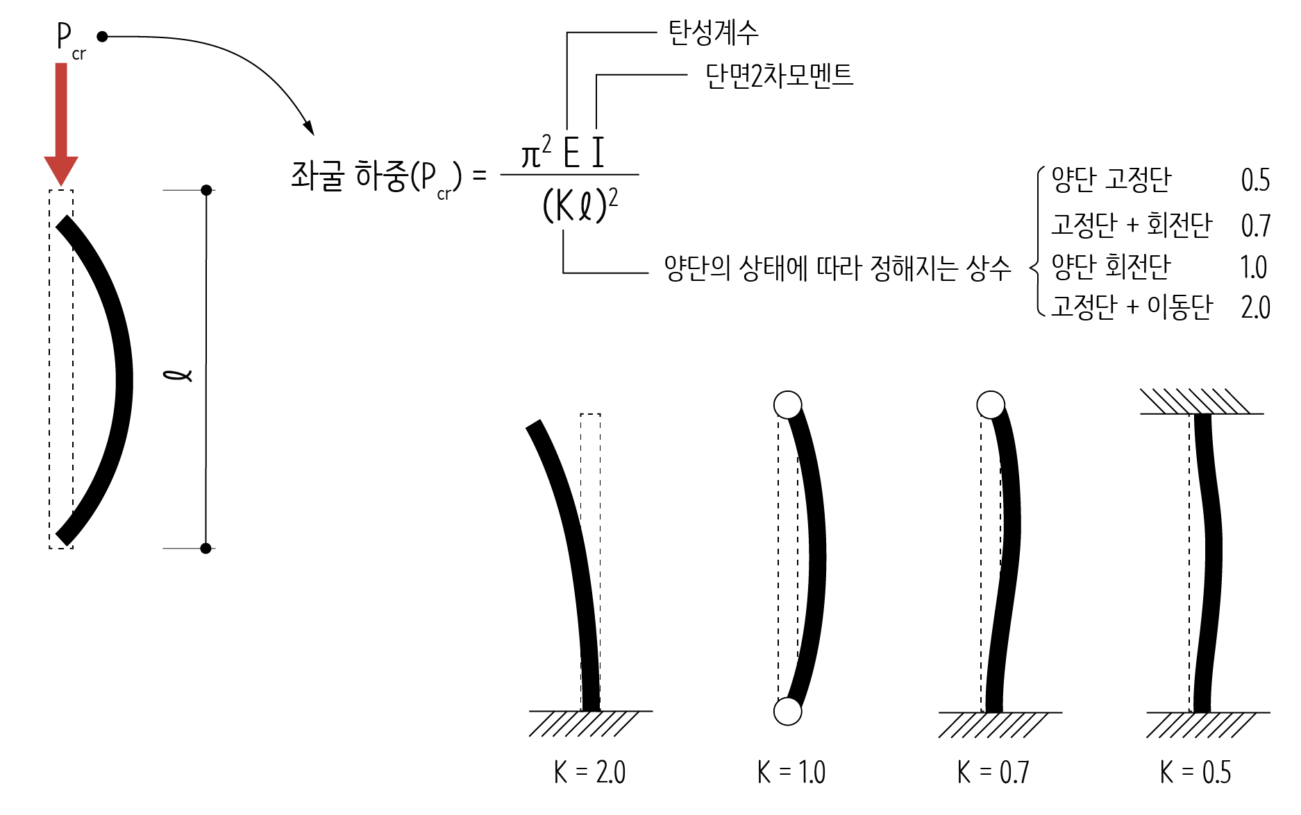 좌굴하중이 클수록 기둥은 쉽게 좌굴되지 않는데 좌굴하중의 계산식을 보면 탄성계수와 단면2차모멘트에 비례하고 길이의 제곱에 반비례합니다. 재료에 따른 차이는 탄성계수, 형태에 따른 차이는 단면2차모멘트, 지지 조건이나 길이에 따른 차이는 좌굴길이로 반영됩니다.