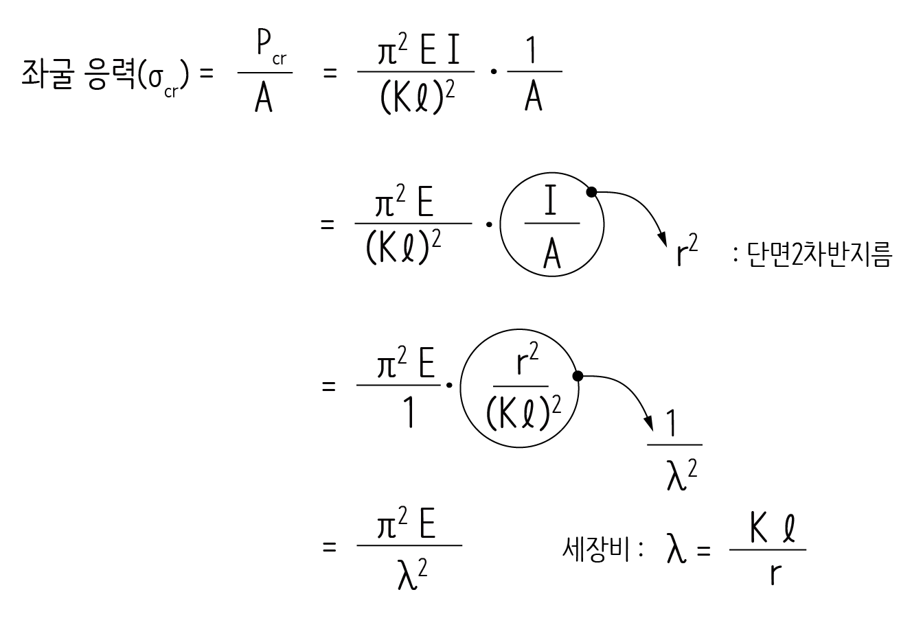 좌굴하중을 단면적으로 나누면 좌굴응력을 계산할 수 있습니다. 단면2차모멘트를 단면적으로 나눈 것을 단면2차반지름이라고 하는데, 단면2차반지름을 대입하면 식을 더 단순하게 만들 수 있습니다.