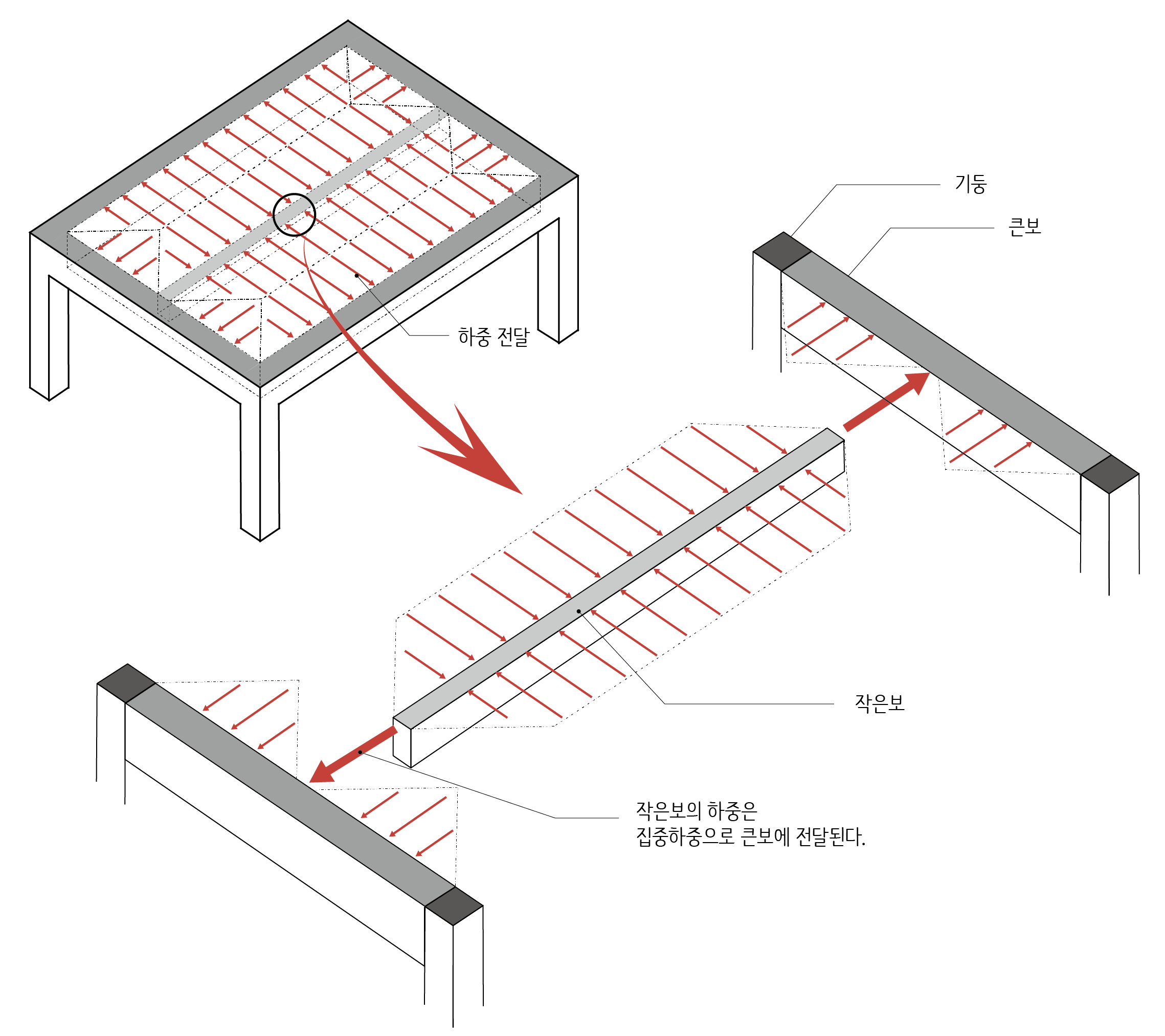 큰보(Girder)는 작은보(Beam)가 전달하는 집중하중과 슬래브 하중 일부를 기둥으로 전달합니다.