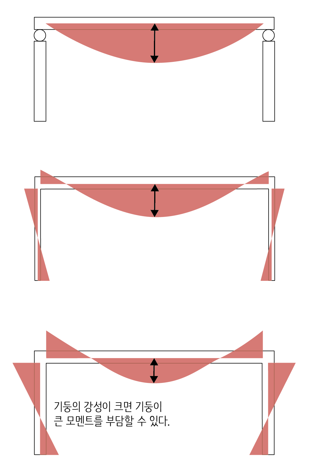 기둥 단면이 크면 큰 휨모멘트에 저항할 수 있고, 단면이 작으면 쉽게 휘어져 저항하기 힘들어집니다. 맨 아래 그림처럼 기둥이 상대적으로 크면 기둥과 인접한 보 단부의 모멘트가 커지게 됩니다. 따라서 보에서 발생하는 휨모멘트 다이어그램을 위로 당기는 효과가 생기고, 상대적으로 보 중앙부의 휨모멘트가 작아집니다. 이런 경우라면 보 하부에 배치하는 철근량을 줄일 수 있습니다.