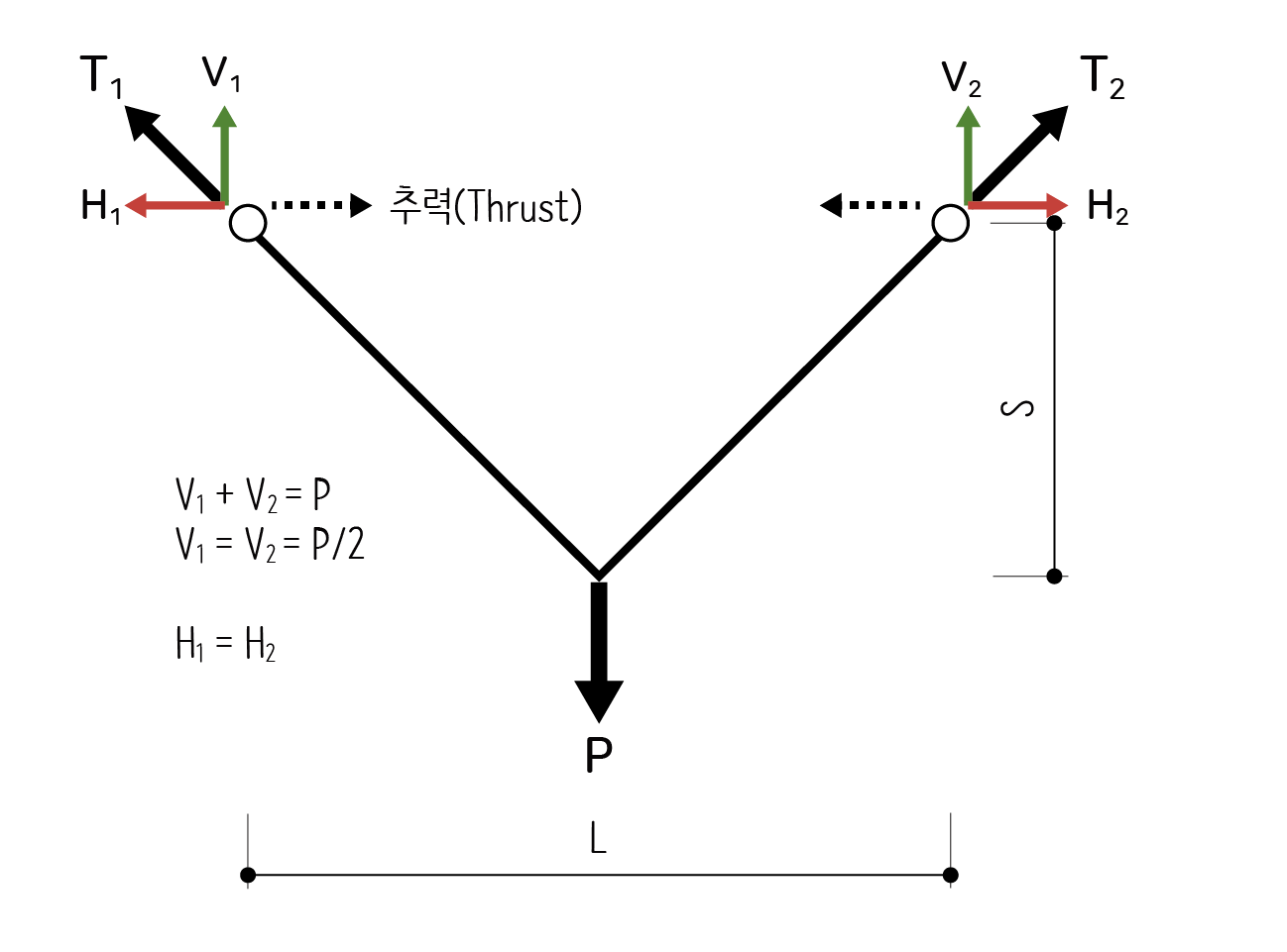 그런데 각각의 지점이 움직이지 않고 안정상태가 되려면 H₁과 H₂에 작용과 반작용처럼 짝힘이 작용해야 합니다. 왼쪽 지지점에서 본다면 H1과 크기가 같고 방향이 반대인 힘이 있어야 균형을 이루게 됩니다. 이 힘을 추력(推力, Trust)이라고 합니다. 수평방향으로 미는(推) 힘입니다. 결국 트러스구조가 안정상태가 되려면 지지점에서 수평방향 안쪽으로 미는 추력에도 견딜 수 있는 능력을 갖추어야 합니다.