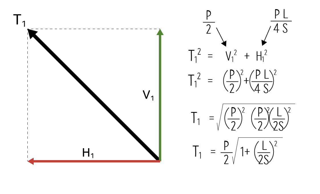 그럼 케이블에서 발생하는 장력은 어떻게 될까요? 아래 그림에서 T₁을 계산하기 위해 피타고라스 정리로 나타냅니다. 그리고 앞에서 계산한 결과를 V₁과 H₁에 대입합니다. 최종 식을 보면 장력은 새그에 반비례합니다. 케이블을 길게 해서 새그를 두 배로 만들면 장력은 1/2로 줄어든다. 이렇게 장력이 작아지면 케이블의 두께를 줄일 수 있습니다. 반대로 케이블을 짧게 해서 새그를 작게 하면 장력이 커지고 케이블도 두꺼워야 합니다.