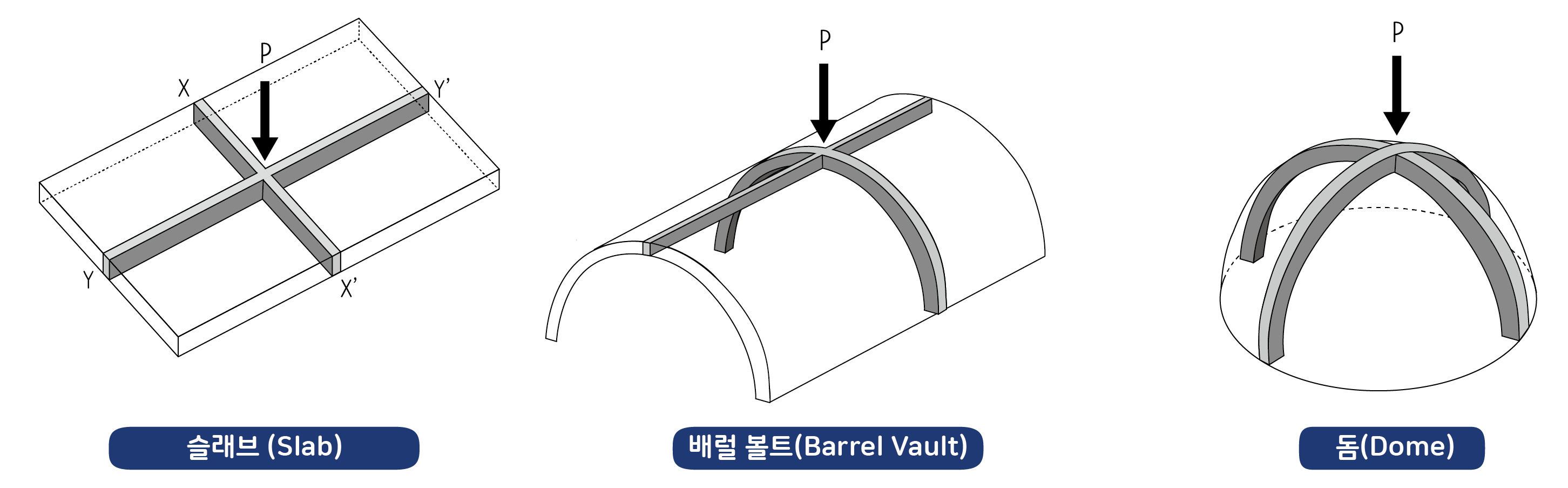 쉘구조의 원리를 이해하기 위해 우선 슬래브 같은 평면판을 어떻게 해석할 수 있는지 살펴보겠습니다. 슬래브에 하중 P가 가해지면 X축과 Y축 두 방향으로 하중이 전달된다고 볼 수 있습니다. 이것은 슬래브를 미세하게 쪼개진 보를 접합해서 만든 것으로 해석하는 방식입니다. 그래서 X축 보 절편과 Y축 보 절편이 하중을 나누어 부담한다고 이해할 수 있습니다.