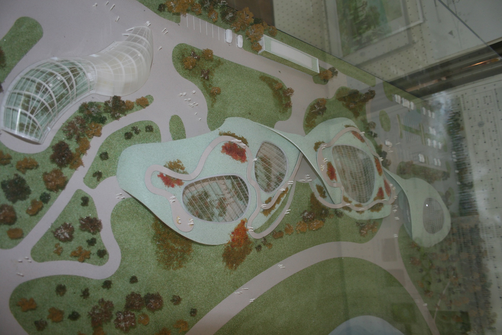 주변에서 흔하게 볼 수 있는 구릉(언덕)을 형상화한 것인지 멀리서 보면 인위적인 건물처럼 보이지 않습니다. 모형에서 볼 수 있는 것처럼 비정형 구릉 세 개가 서로 안으로 겹쳐서 내부를 이동하다보면 내외부를 넘나들게 됩니다. 남쪽 블록은 다양한 식물과 열대어 등을 체험할 수 있고, 중앙블럭은 아열대와 열대 학습코너, 불꼭 블럭은 그린 갤러리리라는 자유공간으로 구성되어 있습니다.