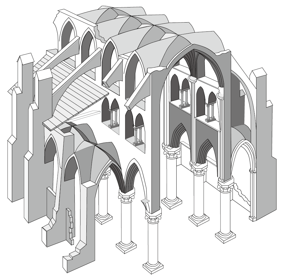 네이브 상부의 추력을 플라잉 버트레스와 부축벽이 지지하면, 네이브를 받치는 피어는 수직하중만 부담하면 되기 때문에 크기를 줄일 수 있습니다. 또 네이브 상부의 벽체도 추력을 부담할 필요가 없기 때문에 두께를 줄일 수 있을 뿐 아니라 개구부를 많이 만들 수 있습니다.