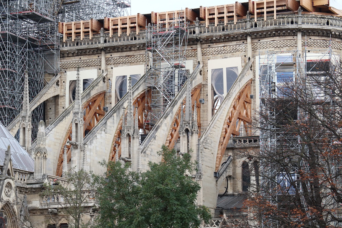 플라잉 버트레스는 네이브 상부와 아일의 부축벽을 연결하는 아치 형상의 부재입니다. 네이브 상부의 리브 볼트에서 리브를 따라 하중이 내려오면 플라잉 버트레스가 이 하중을 아일의 부축벽으로 유도합니다.