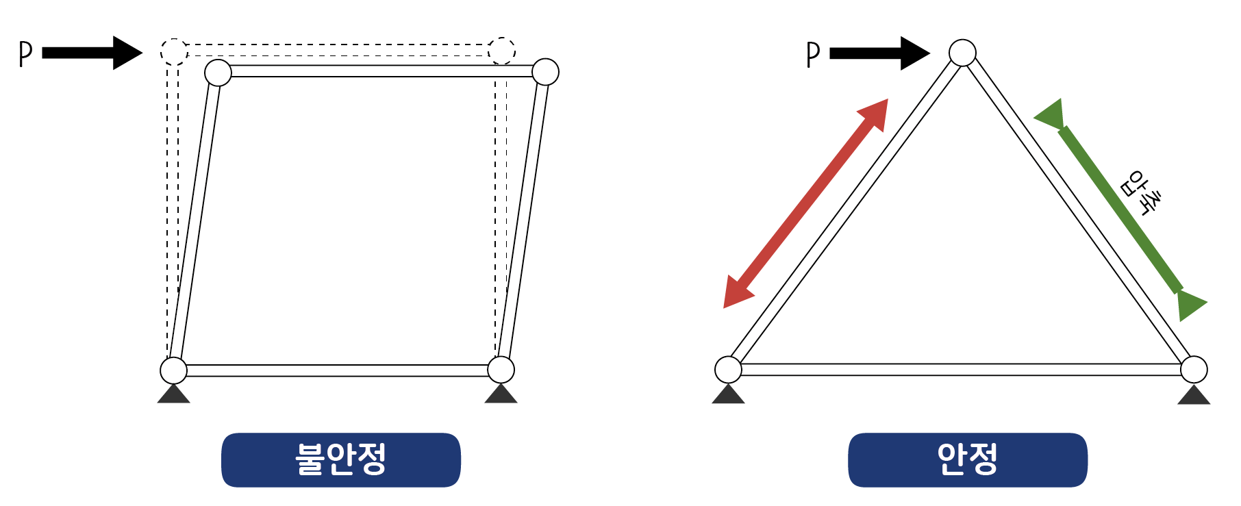 일반적으로 구조재료는 휨보다는 압축이나 인장 같은 축 방향 응력에 강합니다. 따라서 압축을 받는 부재의 좌굴만 조심한다면 비교적 작은 부재로 트러스를 구성하는 것이 가능합니다.