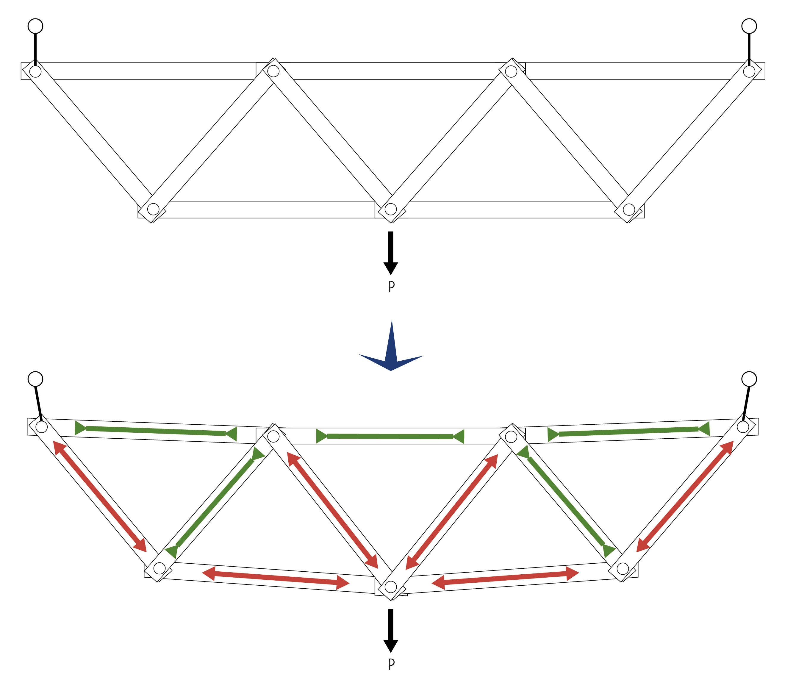 이 절점에 연결된 부재 네 개는 아래쪽으로 당겨지면서 늘어나는 힘(빨간색 부재)을 받게 됩니다. 그리고 삼각형을 구성하는 부재 두 개가 아래쪽으로 늘어나게 되면 나머지 부재 한 개에는 압축력이 작용하게 됩니다. 결국 늘어나는 부재 네 개 사이에 끼어있는 부재 세 개에는 압축응력(초록색 부재)이 발생합니다. 트러스는 이렇게 트러스를 구성하는 개별 부재가 압축력 또는 인장력을 부담하면서 넓은 공간을 지지할 수 있습니다.