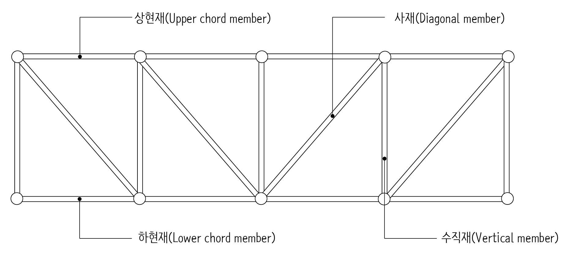 트러스는 삼각형으로 짜야 하기 때문에 경사 부재인 사재(Diagonal member)가 있습니다. 트러스 윗부분을 구성하면서 수평으로 평행하게 가로지르는 부재를 상현재(Upper chord member), 아래쪽 부재를 하현재(Lower chord member) 라고 합니다.