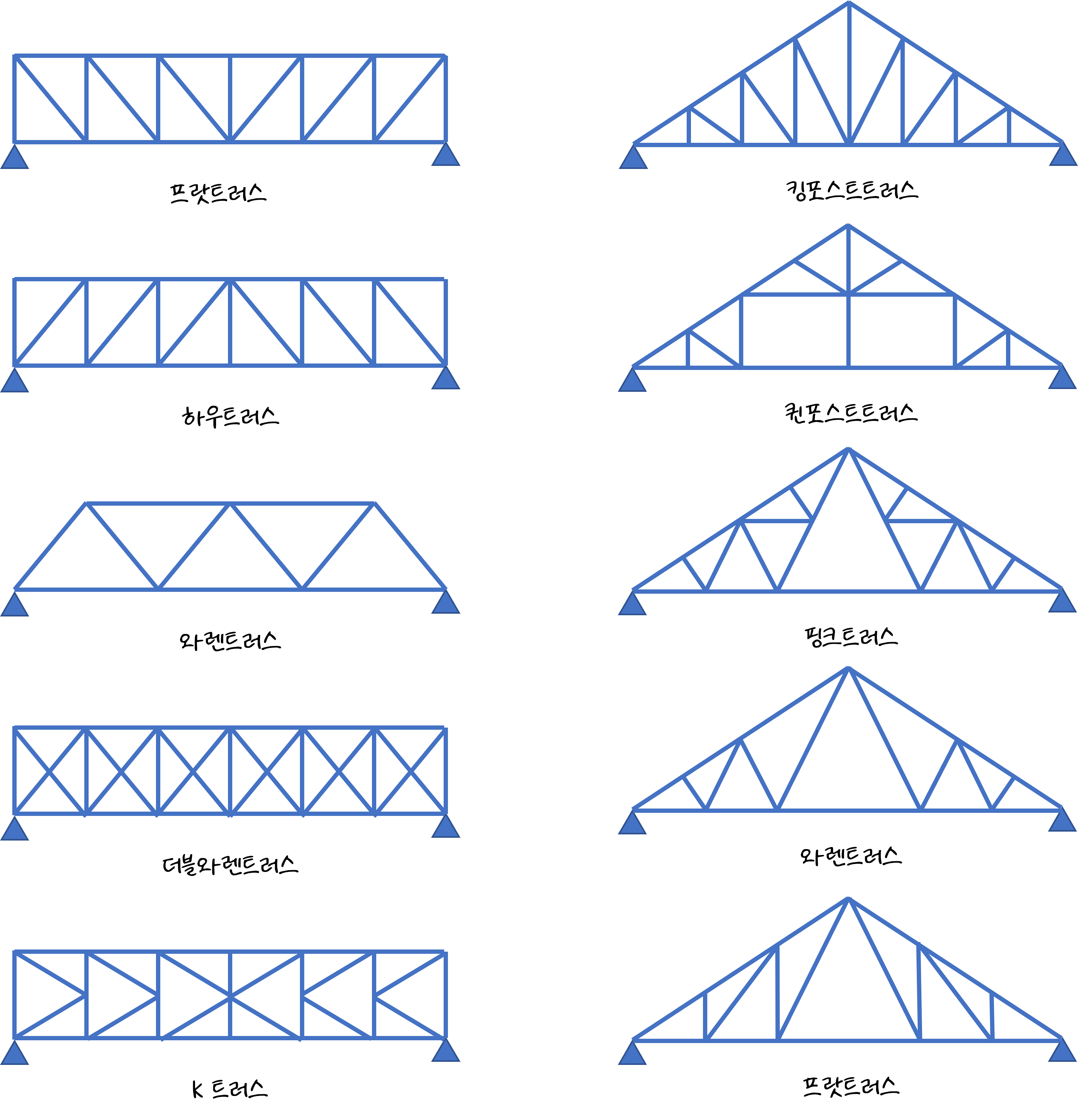 트러스의 장점은 크기가 작은 막대 모양의 부재를 삼각형 형태로 엮어 규모가 큰 지붕을 만들 수 있는 점입니다. 삼각형으로 짜인 막대는 어떻게 안정적인 구조가 될 수 있을지 트러스구조에 대해 살펴보겠습니다.