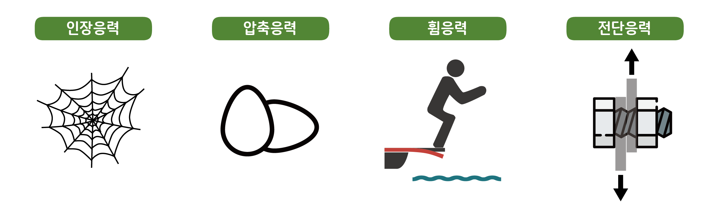 부재를 잡아당기면 늘어나고, 누르면 찌그러지며, 구부리면 휘어지고, 엇갈리게 누르면 비스듬히 미끄러집니다. 외력이 작용하는 방식에 대응하여 각각 인장, 압축, 휨, 전단응력이라고 부릅니다.