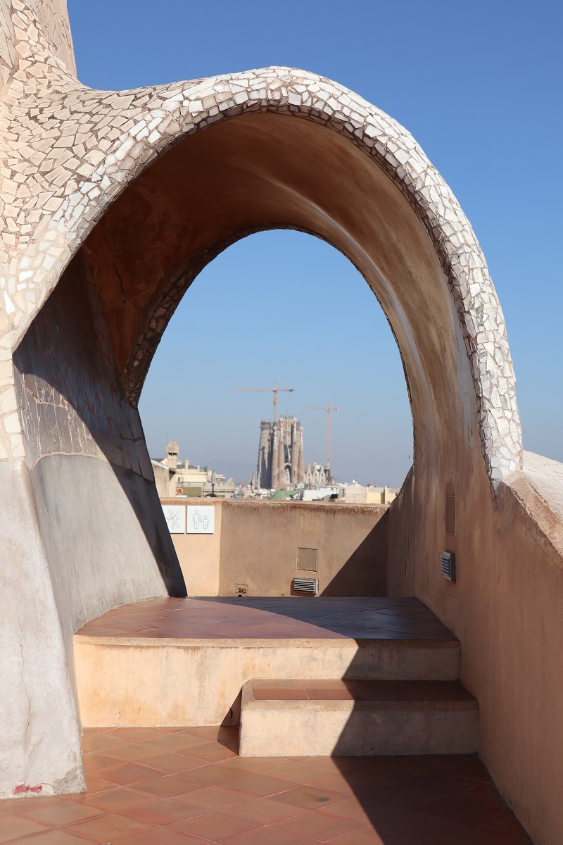 옥상의 한쪽 구석에는 굴속 같은 통로가 만들어져 있는데, 이 통로에서 보면 저 멀리 가우디의 걸작인 사그라다 파밀리아가 보입니다.