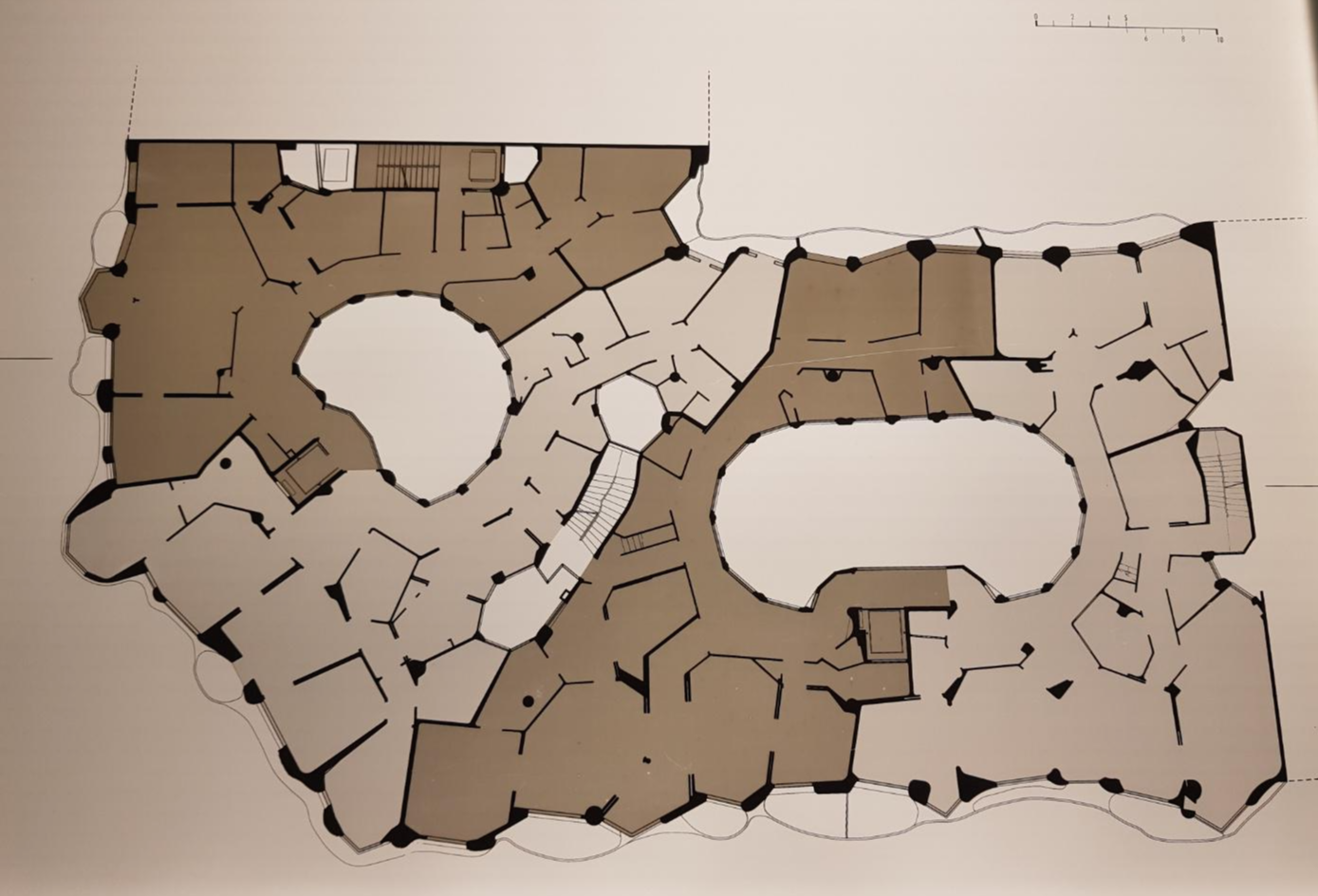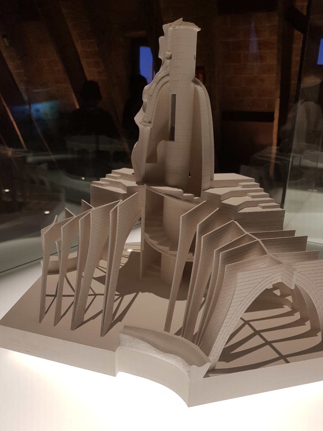 옥상에는 굴뚝, 환기통, 계단실이 환상적인 조각품으로 만들어져 매우 신비한 느낌을 자아냅니다. 아래 모형을 보시면 계단실을 중심으로 아래층에 아치구조가 어떻게 만들어졌는지 알 수 있습니다.