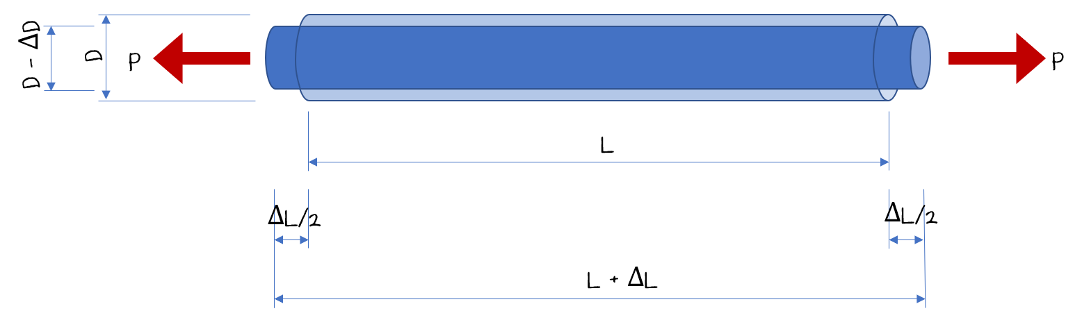 다음 그림과 같은 원통형 물체에 인장력이 가해졌다고 가정해보겠습니다. 원래 원통은 원통의 지름이 D이고 길이가 L이 원통이라고 가정하겠습니다.