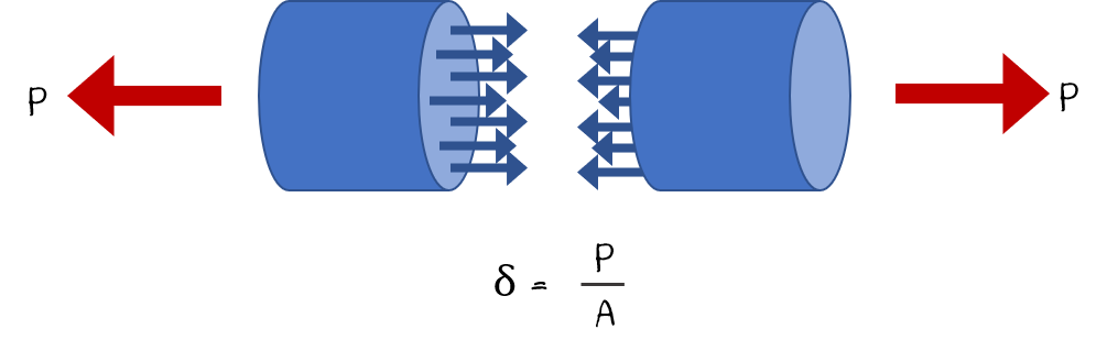 이 응력을 보통 δ로 표기하는데 이 응력은 보통 단위면적당 힘의 크기로 나타내기 때문에 축방향력을 단면적으로 나누어서 표기합니다. 따라서 δ = P/A가 됩니다.