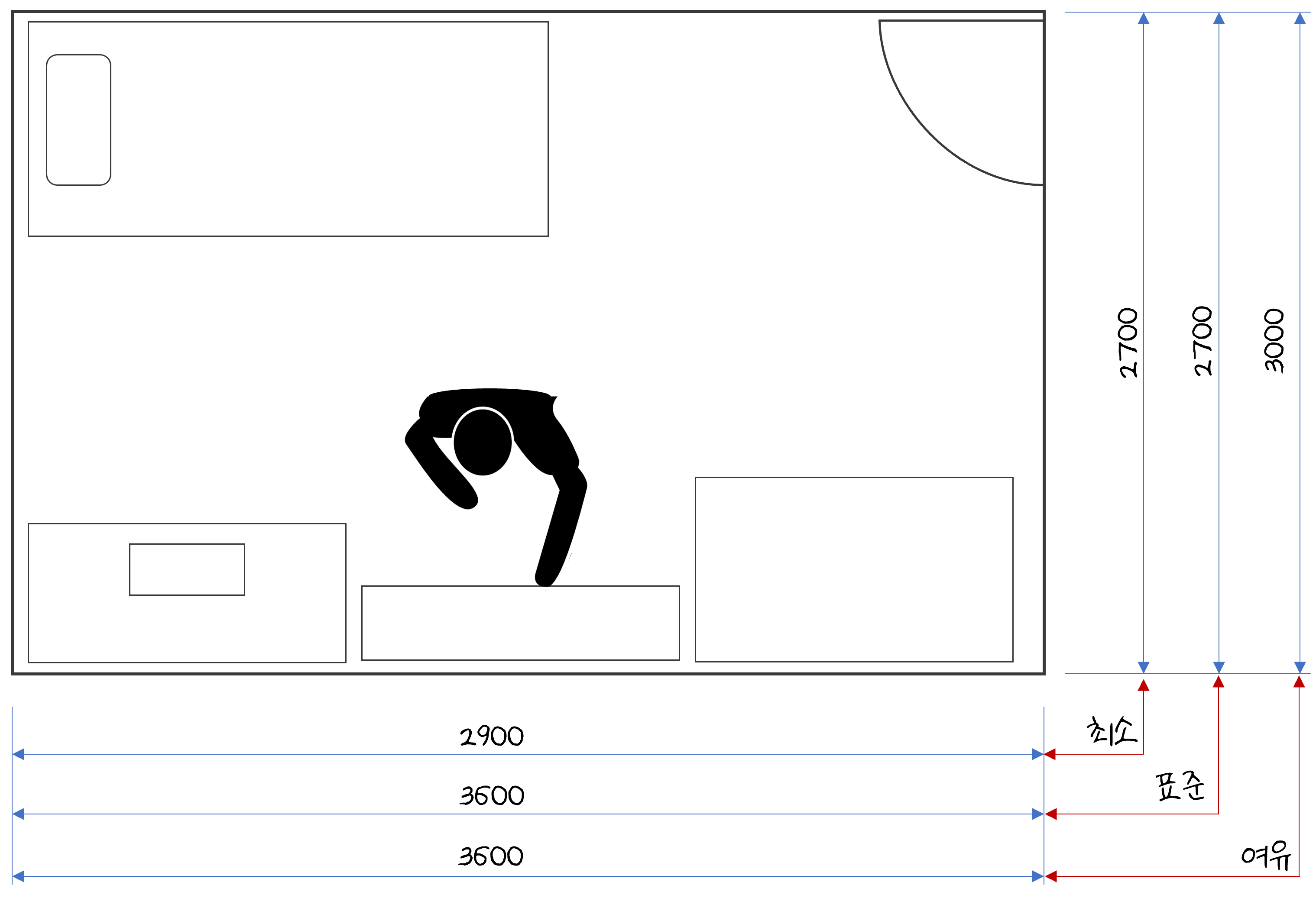 1인용 침대 및 책상, 책장, 옷장을 수납할 수 있는 최소한의 방의 크기는 보통 2900 × 2700 을 잡습니다.