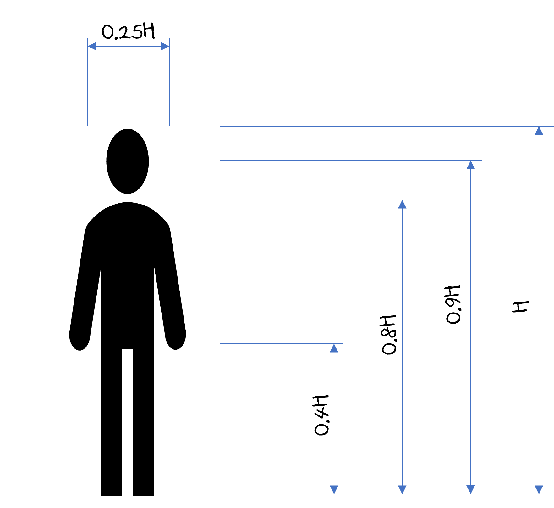 키(H)를 기준으로 눈의 높이, 어깨 높이, 가랑이까지의 높이의 개략적인 값은 다음과 같습니다.