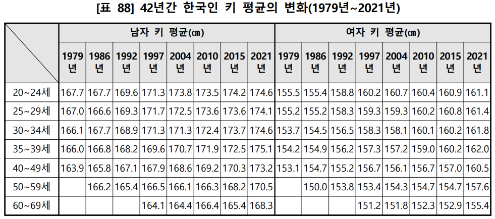 한국인의 표준키는 다음과 같습니다. 자료는 사이즈코리아 홈페이지(sizekorea.kr)에서 제공하는 8차 인체치수조사 (2020~21) 결과를 발췌한 것입니다.