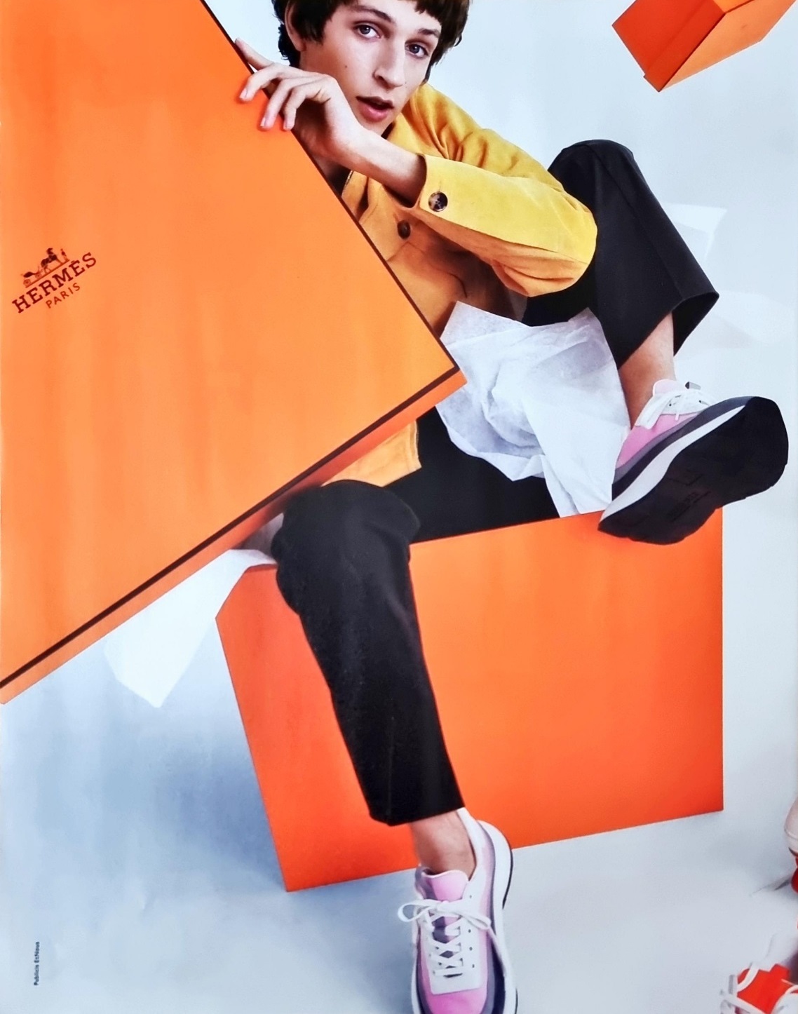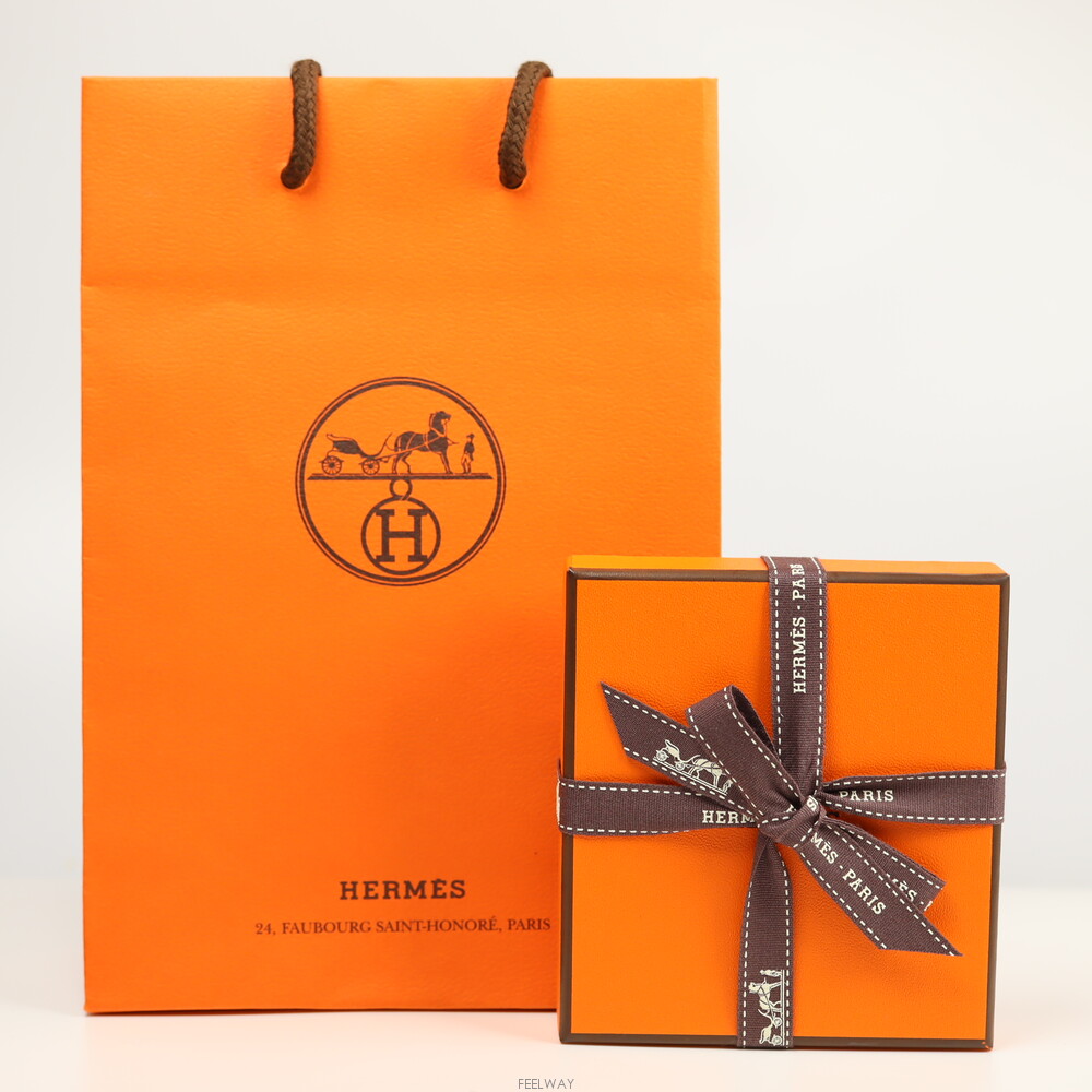 제2차 세계대전 이후 몇 년동안 헤르메스가 포장박스로 쓸 수 있는 보드지(Papaeboard)는 색깔이 오렌지였습니다. 헤르메스는 그 브랜드 인지도를 잃고 싶지 않았기 때문에 그 후로도 오렌지색을 유지해 왔습니다. 이 색조의 오렌지는 흑색이 꽤 많이 포함되어 있는데, 이 때문에 전통적인 가치와 품질에 대한 감각을 전달할 수 있습니다.