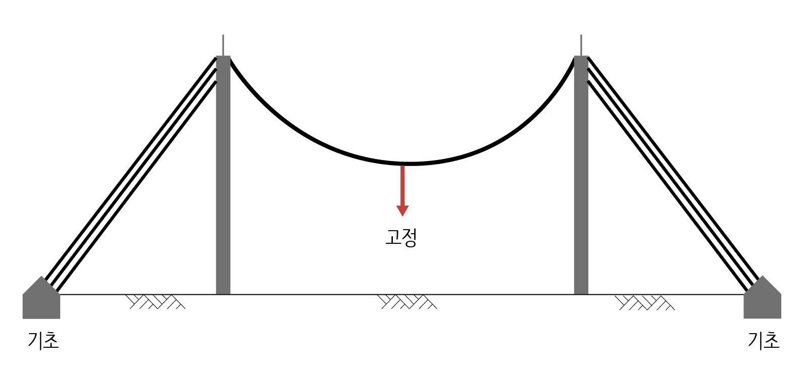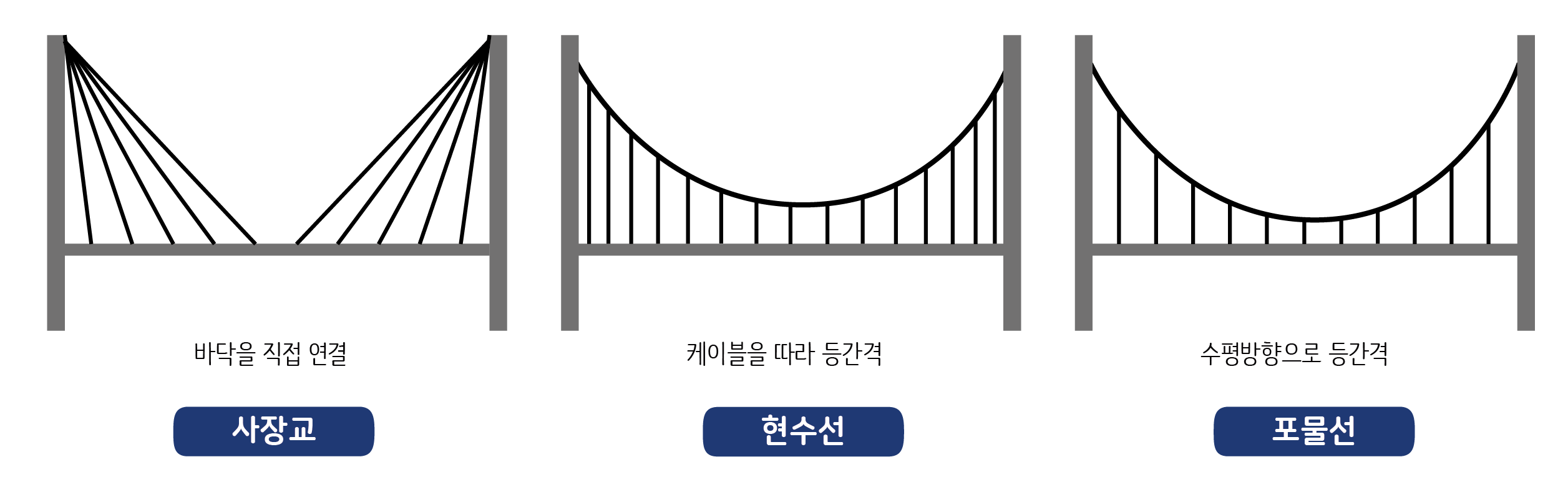 사장교(Cable-stayed bridge)는 바닥판을 직접 주각과 연결하는 방식입니다. 메인 케이블을 양쪽 주각에 고정하고 상판을 매단 케이블을 메인 케이블에 연결하면 현수교(Suspension bridge)가 만들어집니다. 이 곡선은 하중에 따라 모양이 약간 달라지는데 거미줄처럼 자중만으로 케이블을 따라 등분포하중이 가해지면 현수선(Catenary)이 되지만, 바닥판을 따라 케이블을 등간격으로 달아매면 포물선(Parabola)이 됩니다.