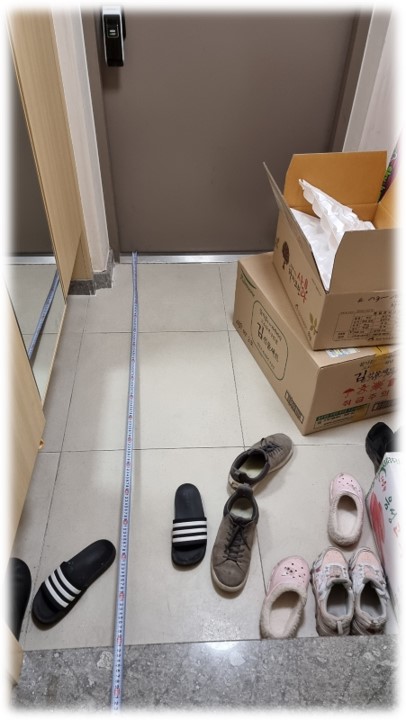 보통 아파트에서는 위 사진에서 볼 수 있는 것처럼 현관바닥이 현관문 폭 정도로 해서 마루로 길게 뻣어있는 식으로 되어 있습니다. 이런 경우는 여유가 별로 없기 때문에 신발을 많이 벗어놓기도 어렵습니다.