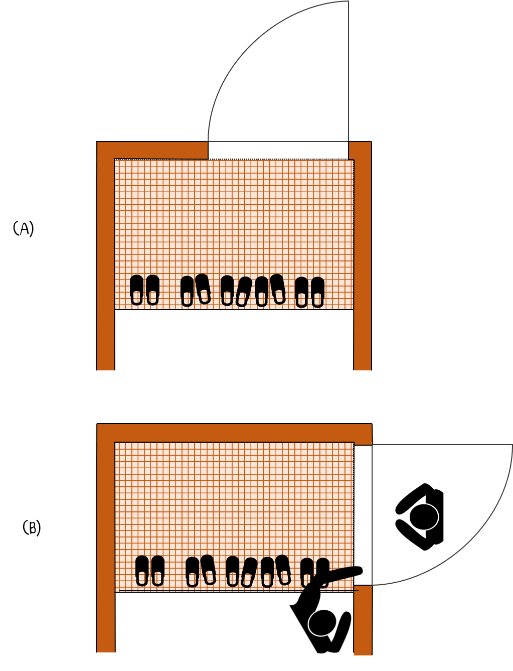 (B)의 경우처럼 마루에 서서 현관문을 열 수 있도록 공간을 계획하는 것도 나쁘지는 않습니다.