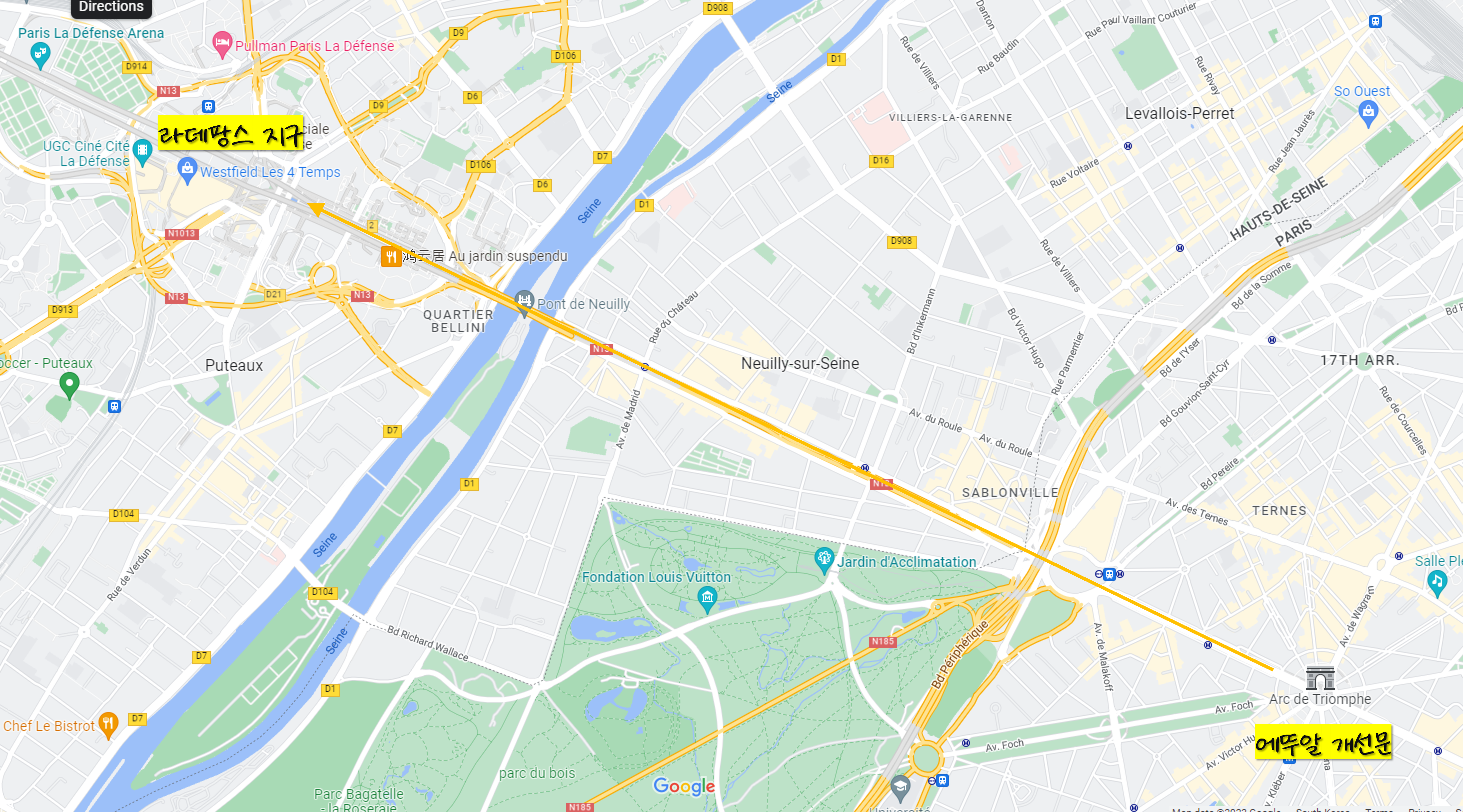 이 축을 따라 에뚜알 개선문을 지나가면 파리의 신도심 개발지역인 라데팡스에 이르게 됩니다.