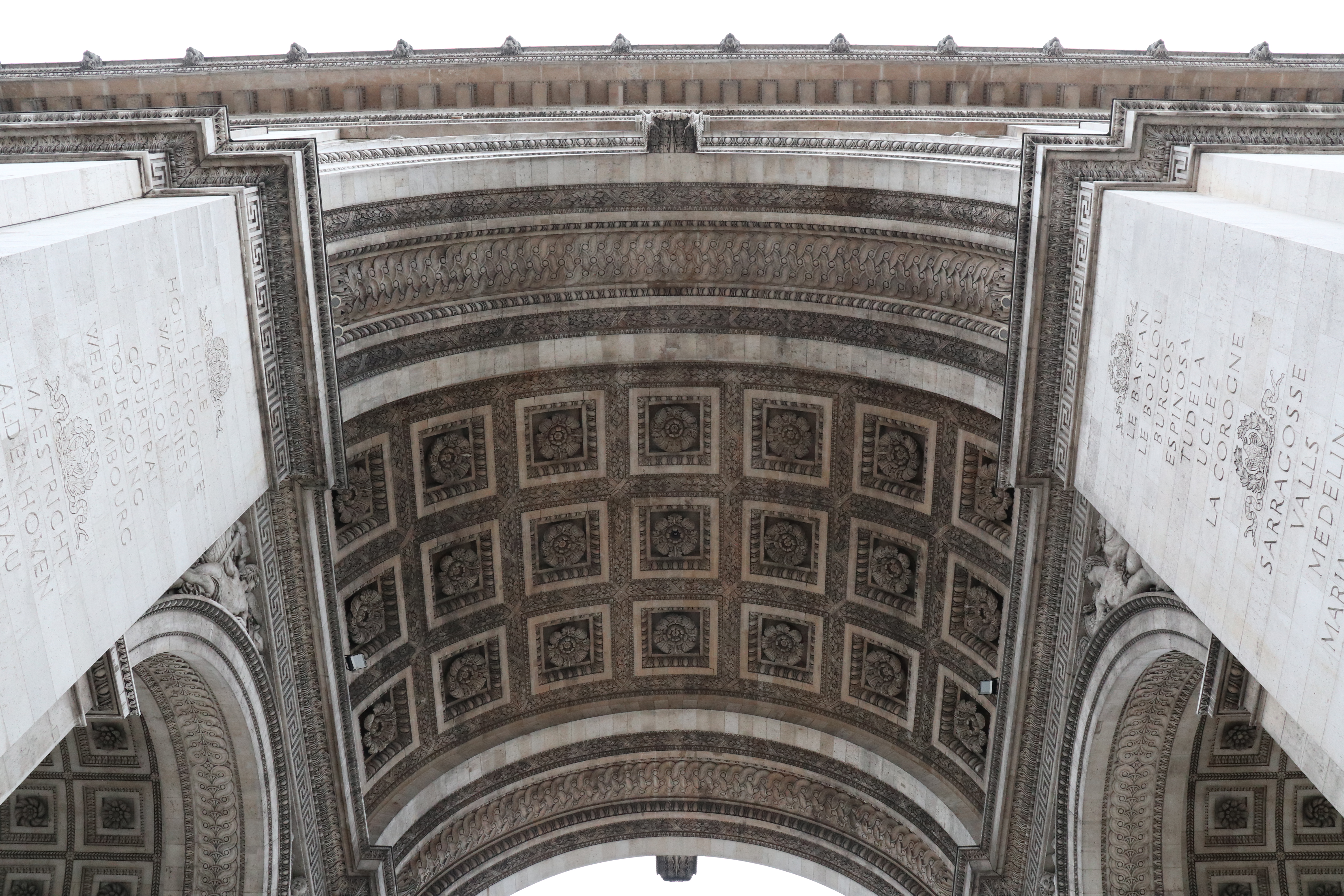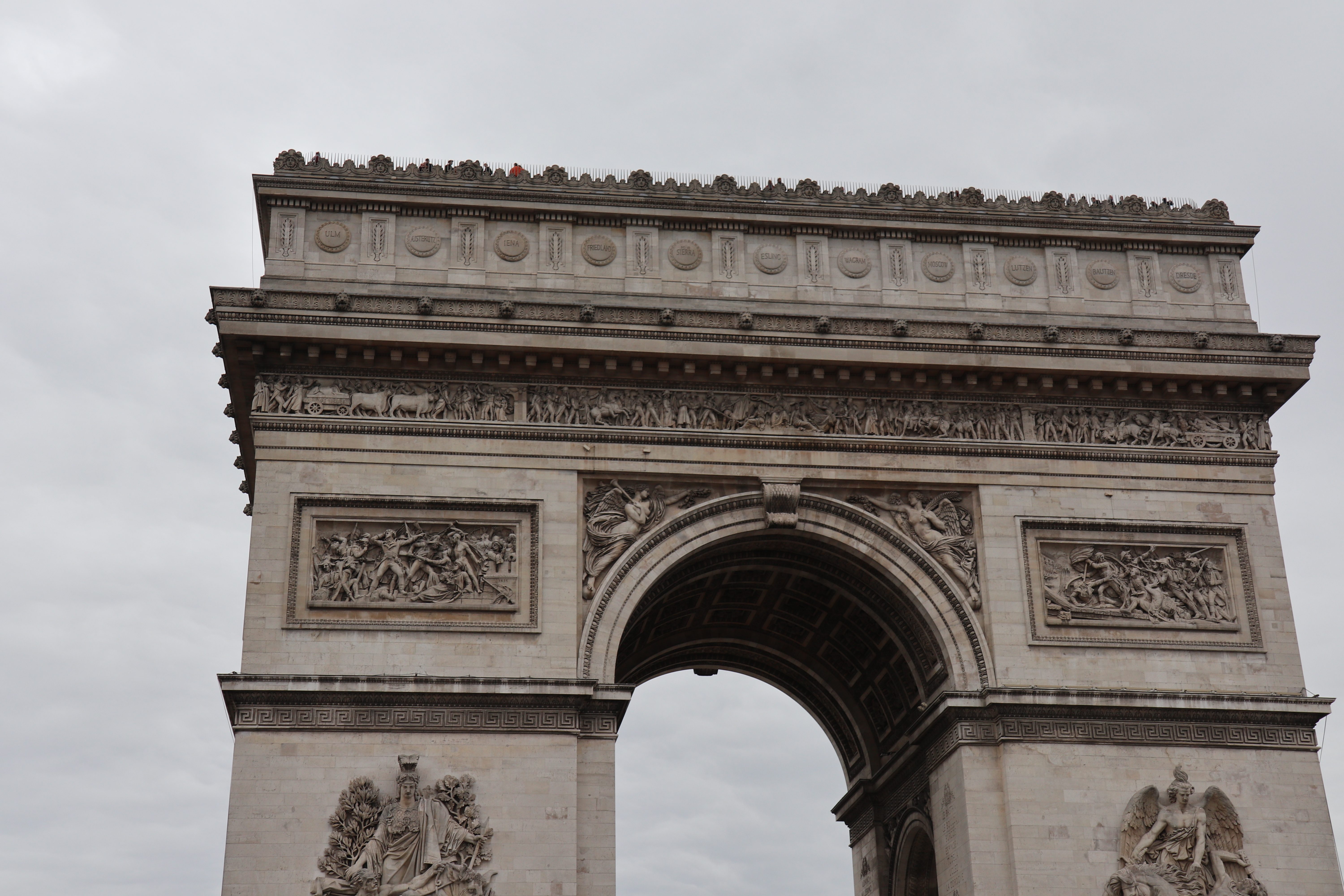윗면에는 작은 부조가 6개 있고 외벽엔 프랑스 공화정 시대와 나폴레옹전쟁(1799∼1815) 때 벌어진 전투 128건의 이름과 이 전투에 참여한 프랑스 장군 558명의 이름이 새겨져 있습니다.